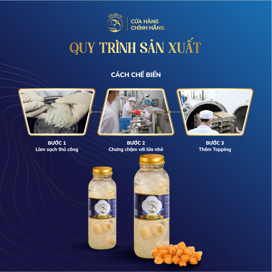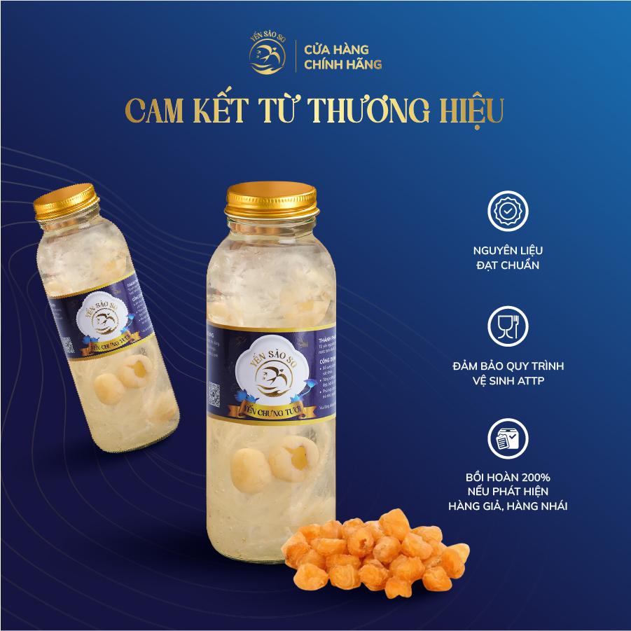 Yến nguyên chất 100 % , không chất phụ gia, không chất tạo mùi, được hấp cách thủy với long nhãn và đường phèn sạch.