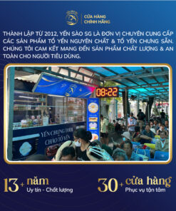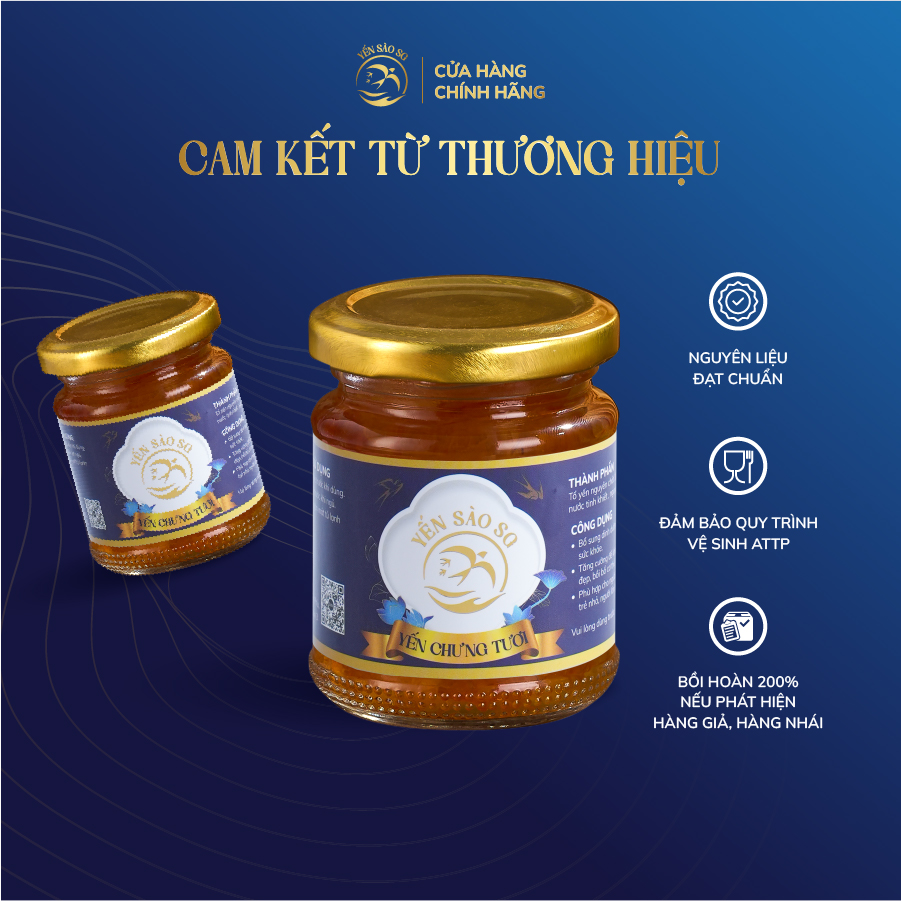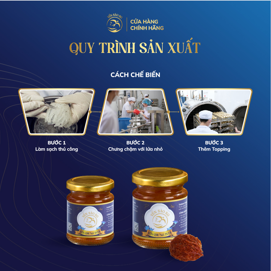 Yến nguyên chất 100 % , không chất phụ gia, không chất tạo mùi, được hấp cách thủy với đường phèn sạch.